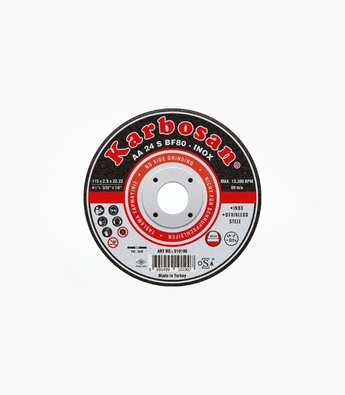 - Paslanmaz çelik (Inox), 304 ve 316 L kalite ince saclarda, 304 kalite paslanmaz çelik boru, lamaların kesim ișlemleri için uygundur. Özel alüminyum oksit așındırıcı tanelere ve sert yapıya sahip ürün, paslanmaz malzemelerin ısıya karșı duyarlı davranıș sergilemesinden dolayı, ısı tesirini en aza indiren bir evsafa sahiptir. Ürün demir (Fe) ve kükürt (S) ihtiva etmez.